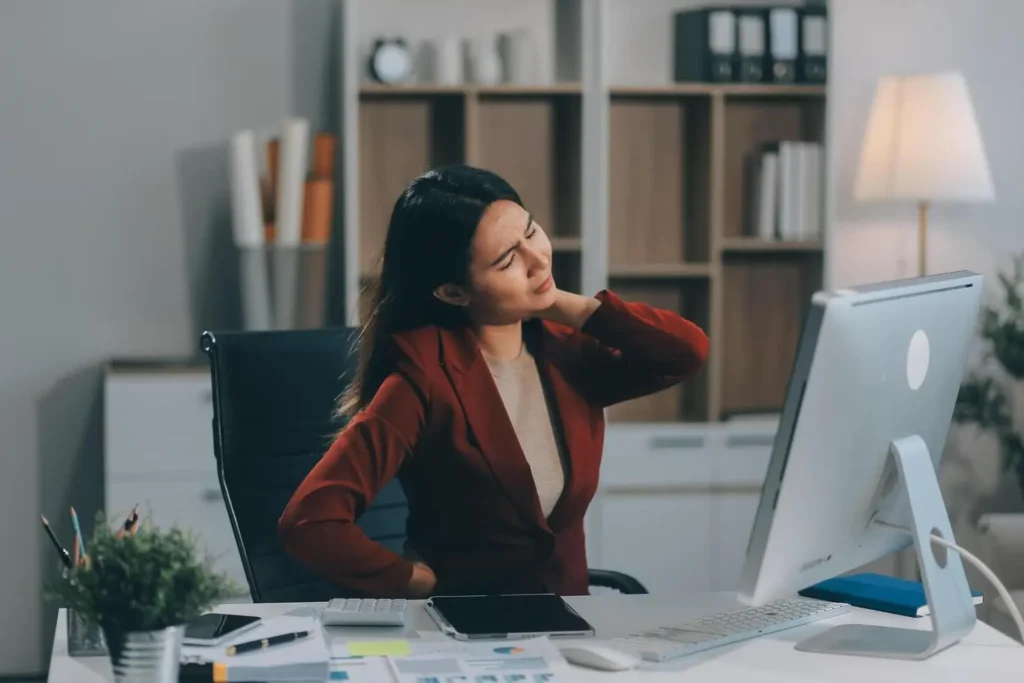 من الأسباب الخفية والمهمة جداً للصداع النصفي هو تشنج عضلات الرقبة. حيث يبدأ الألم غالباً في الرقبة ثم ينتشر إلى الرأس، ويزداد شدته عند إمالة الرأس أو تحريكه. وعادة ما يكون الصداع في جانب واحد مع شعور بثقل في الرأس أو توتر قوي في مؤخرته. حوالي 90% من حالات تشنج الرقبة تنتج عن الجلوس الطويل أمام المكتب أو الكمبيوتر مع إمالة الرقبة للأمام لساعات طويلة (الوضعية المعروفة بـ “رقبة الهاتف” أو Text Neck)، وهذه الوضعية تعيق الدورة الدموية الطبيعية وتضغط على الأعصاب المغذية للرأس. تتفاقم المشكلة بسبب نمط الحياة الخامل، قلة الحركة، والتوتر النفسي المزمن. كما أن النساء أكثر عرضة لهذه التشنجات المستمرة نتيجة ساعات العمل الطويلة على الكمبيوتر وحمل حقيبة اليد دائماً على الكتف نفسه.