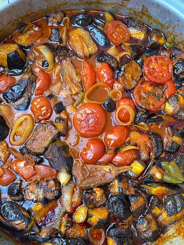 5. تربيب المكونات: يذهن قاع صينية بالقليل من الزيت. نضع شرائح البطاطس كطبقة أولى. ثم تضاف شرائح الباذنجان، ثم اللحم. توزّع فوقها البصل، الطماطم، والفلفل الأخضر. تضاف صلصة الطماطم ويُترك على نار متوسطة حتى ينضج اللحم وتتجانس المكونات.